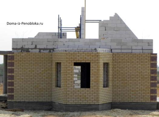 Для большего удобства сначала выстраивают углы, поднимая их на высоту 4-5 камней, после чего полученные проёмы закладываются пеноблоками.