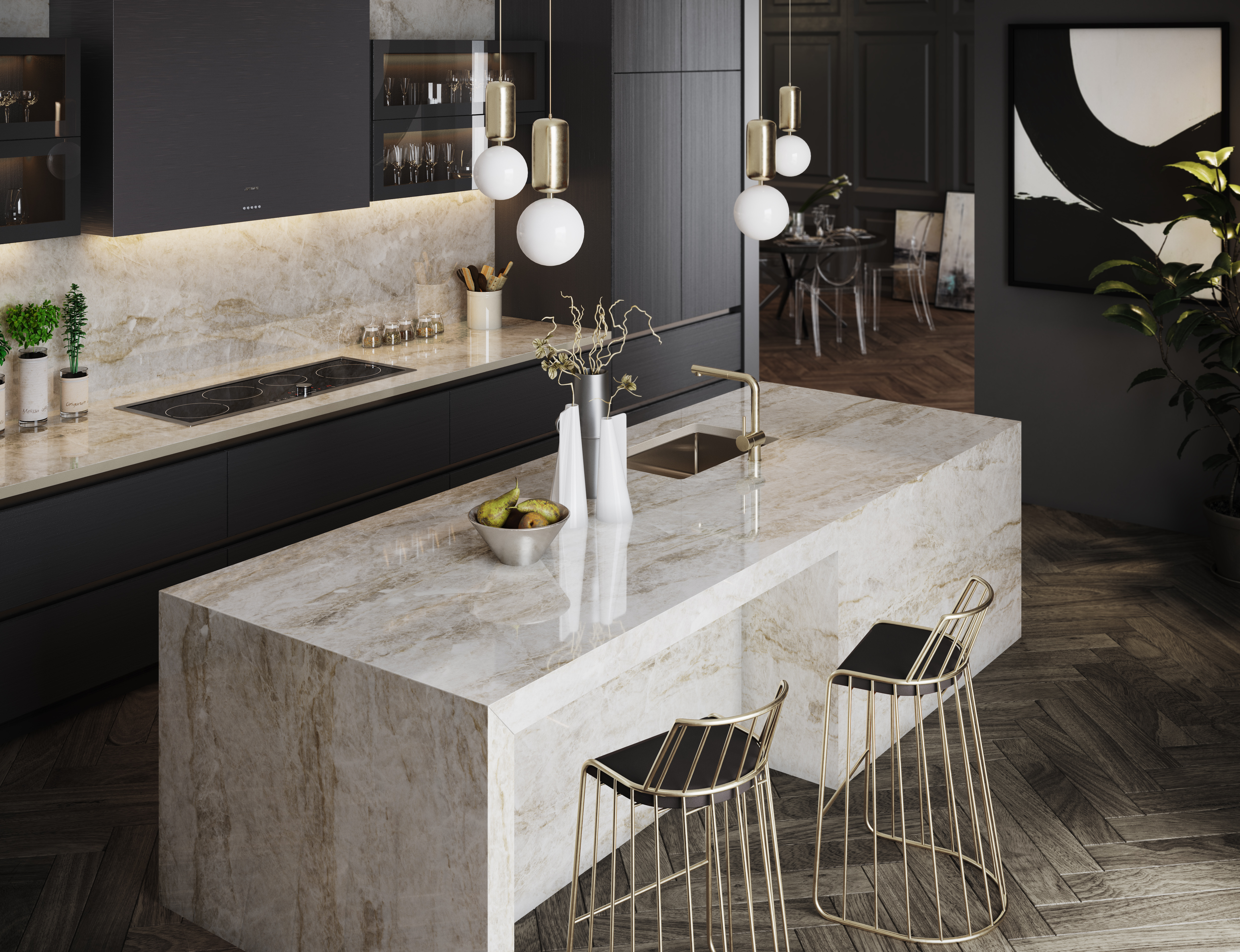 Dekton Khalo — это яркая столешница в деревенском стиле, очень похожая на натуральный гранит. Неравномерные узоры кремового, бледно-золотого и кофейного цветов оживают благодаря ультраглянцевой поверхности. Dekton Khalo особенно хорошо сочетается с серыми, белыми или деревянными шкафами.