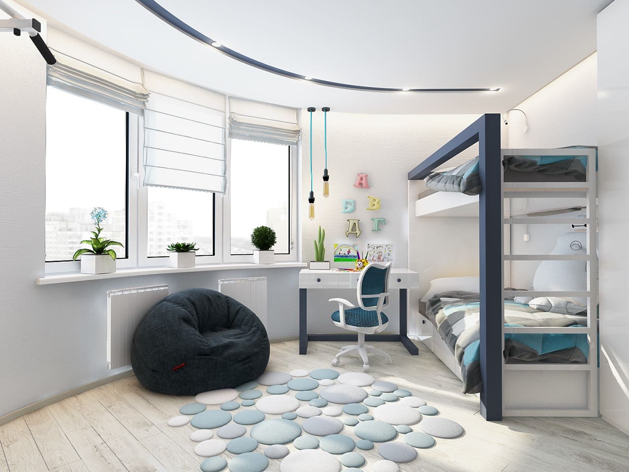 Также подумайте об уменьшении площади мебели, чтобы пространство казалось больше. Подвесные шкафы, узкие двухъярусные кровати и места для хранения, максимально использующие пространство на стене, помогут зрительно увеличить пространство на полу, поэтому и комната будет казаться больше.