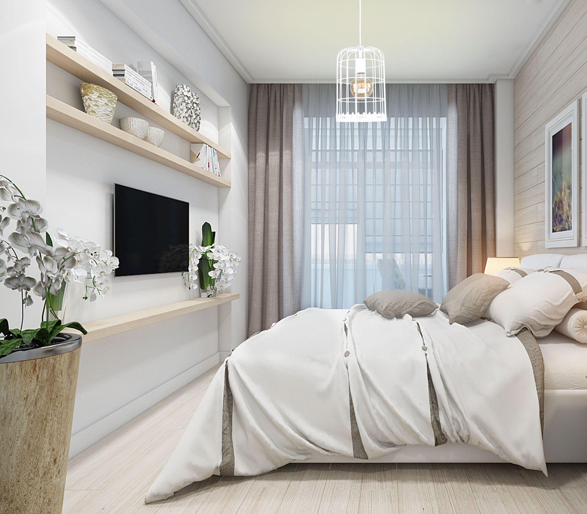 Широкая кровать — прекрасный буфер, который не даст спальне выглядеть коридором. Однако, увлекаться продольной расстановкой шкафов и комодов всё же не стоит.