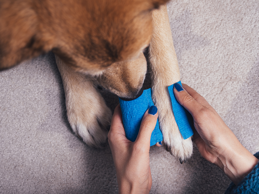 Первая помощь. Если на лапах вашей собаки небольшой порез или рана, обработайте их антибактериальным раствором, нанесите антибактериальный крем, а затем завяжите легкой повязкой.