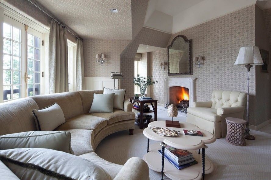 В большом помещении можно разместить полукруглый диван. Он довольно эффектно выглядит и позволяет большой компании с удобством и комфортом устроиться перед телевизором.