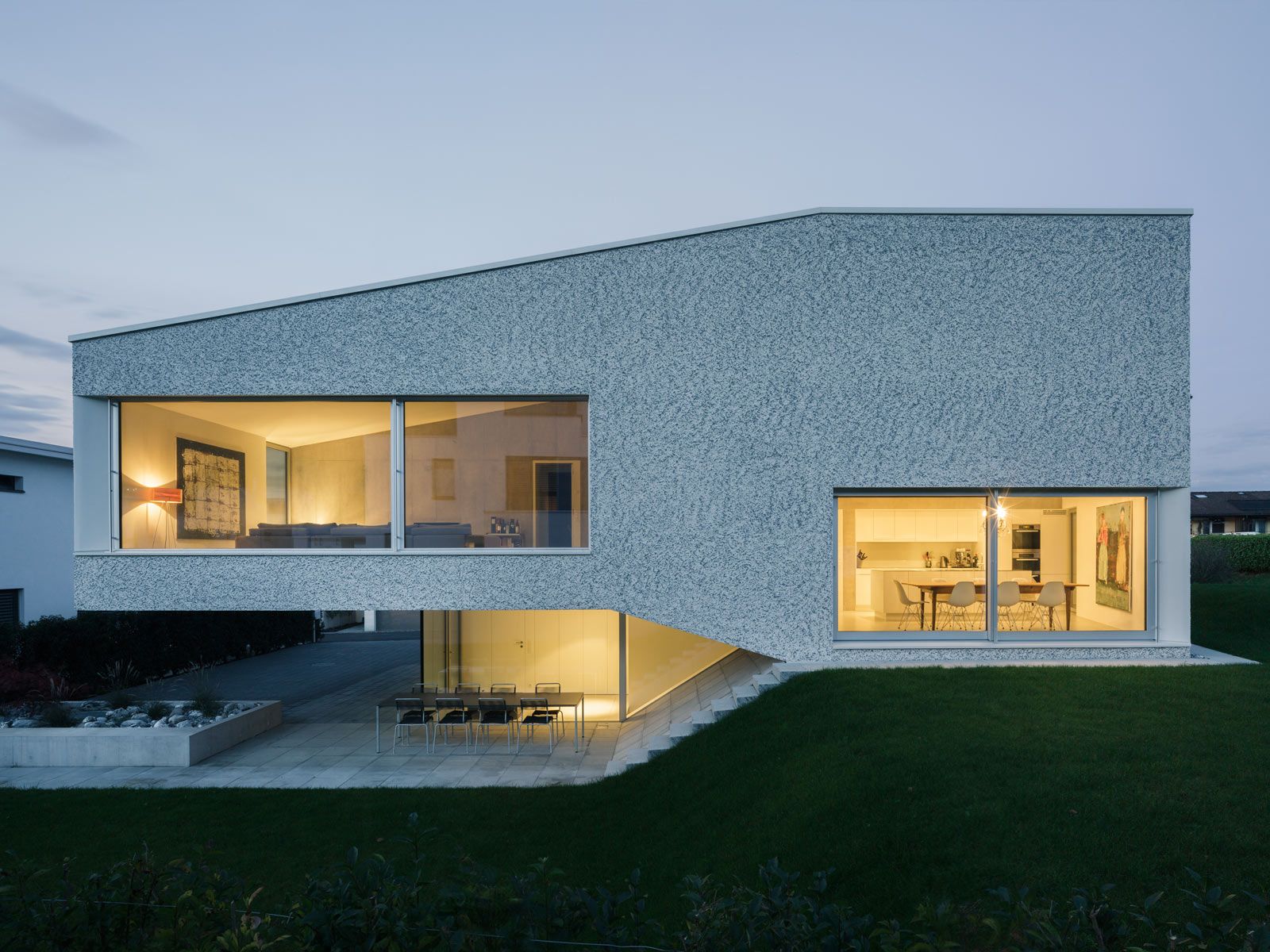 Нейтральная палитра дома — бетонные полы и стены, большие стеклянные проемы, потолки из фанеры и стальная конструкция — перетекает из помещения на улицу. Использование бетона и больших пространств стекла действует как теплоотвод, поглощая тепло от солнечного света в течение всего дня и выделяя это тепло ночью.