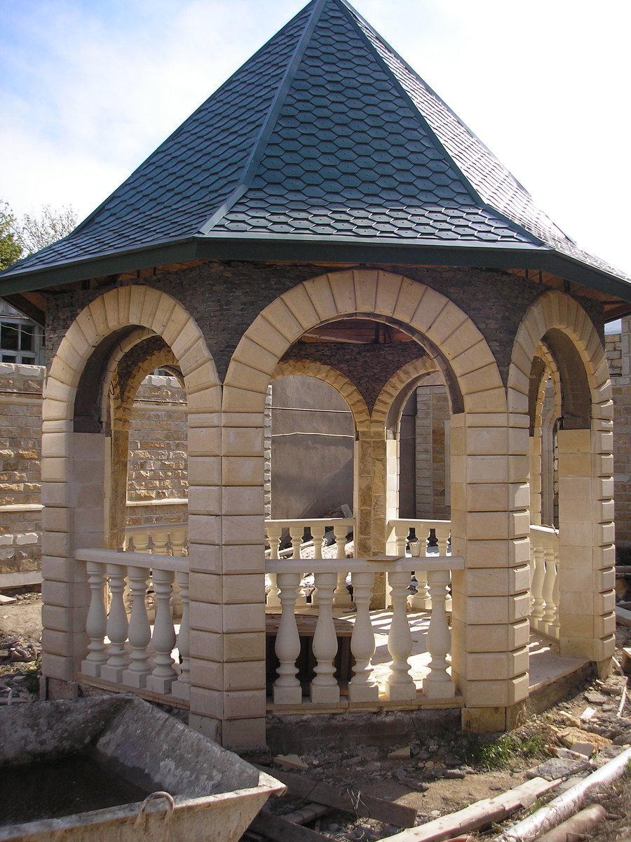 Вариант беседки из известняка и крыши из дерева- огнеупорность;