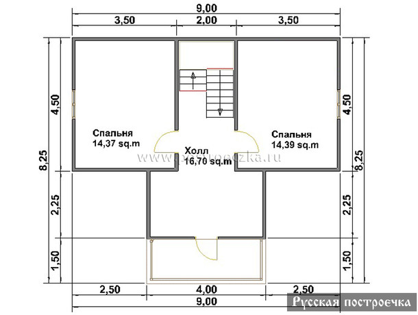 • В плане домика №2 не предусмотрено отдельное помещение под кухню. Зато, холл и гостиная имеют хороший метраж, что позволяет организовать небольшую кухонную зону. Мансарду полностью занимает большая спальня.