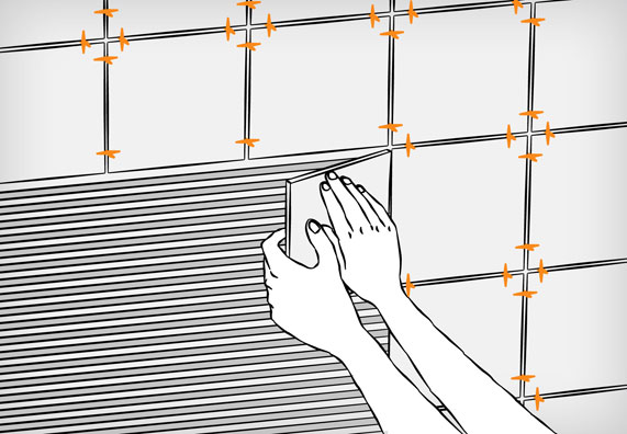 Для укладки плитки достаточно просто выровнять ее по соответствующей разметке на стене и прижать к клею. Делайте это по одному и не забывайте размещать прокладки между плитками (это поможет вам добиться одинакового расстояния между каждой плиткой). Убедитесь, что вы установили прокладки достаточно плотно, чтобы они не выступали над поверхностью плитки. Вы будете заливать раствором распорки, поэтому вы не хотите, чтобы они торчали и выглядели неприглядно.